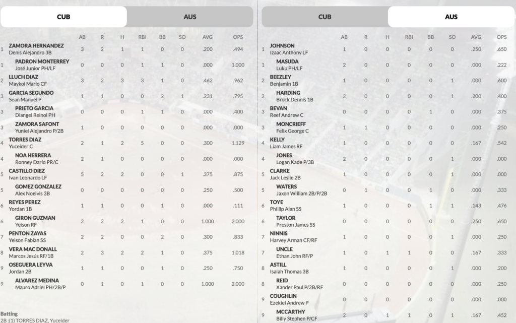 Australia grinded away as a team with the bat. Nine different players collected a combined ten hits. Cooper Barber went 1-for-3 with 3 RBI while Sebastian Beezley had two hits.