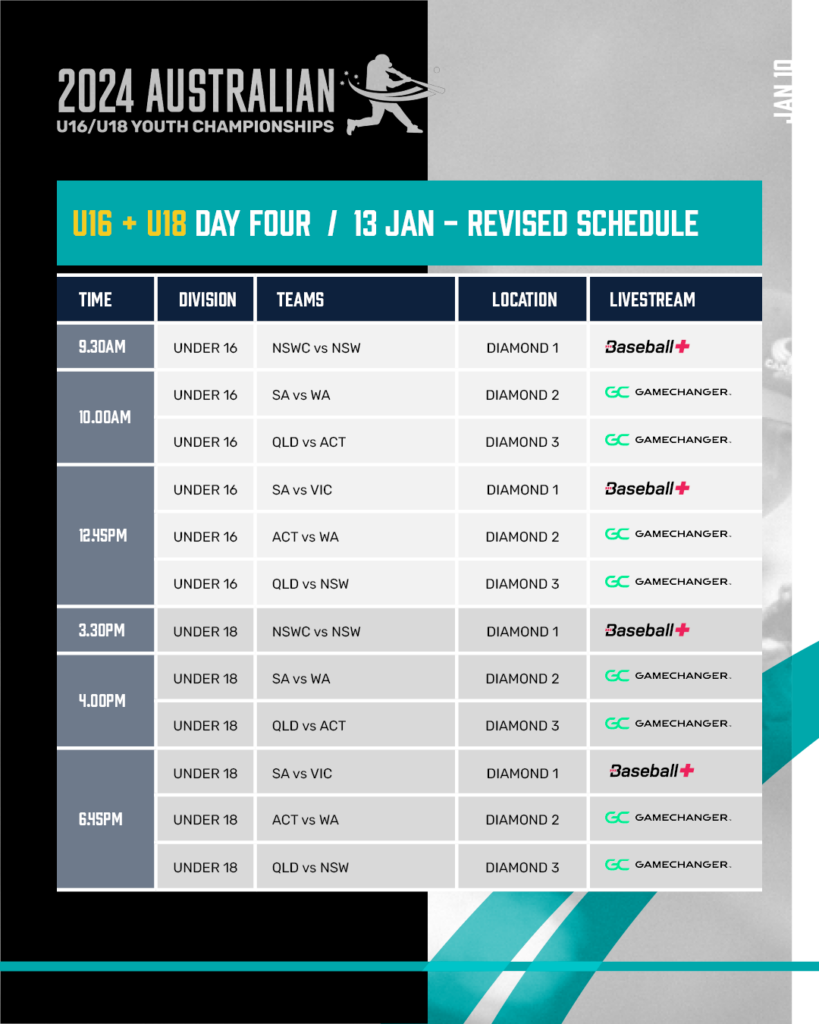 There will be no baseball played on Day 6 of the Australian Youth Championships.