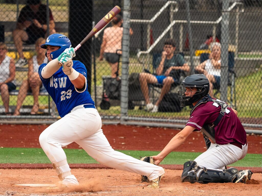 The most notable contributions were from Austin Turner and Jackson Leighton. Turner’s RBI triple (below) was the hit that gave NSW the lead, and they never looked back. Leighton’s two-RBI double solidified their lead, 5-2.